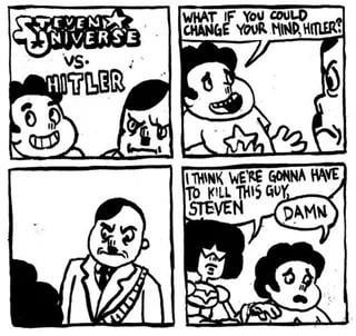 Panel 2: Steven Universe has an earnest look on his face and says "What if you could change your mind, Hitler?" while Hitler looks on with a stern face.