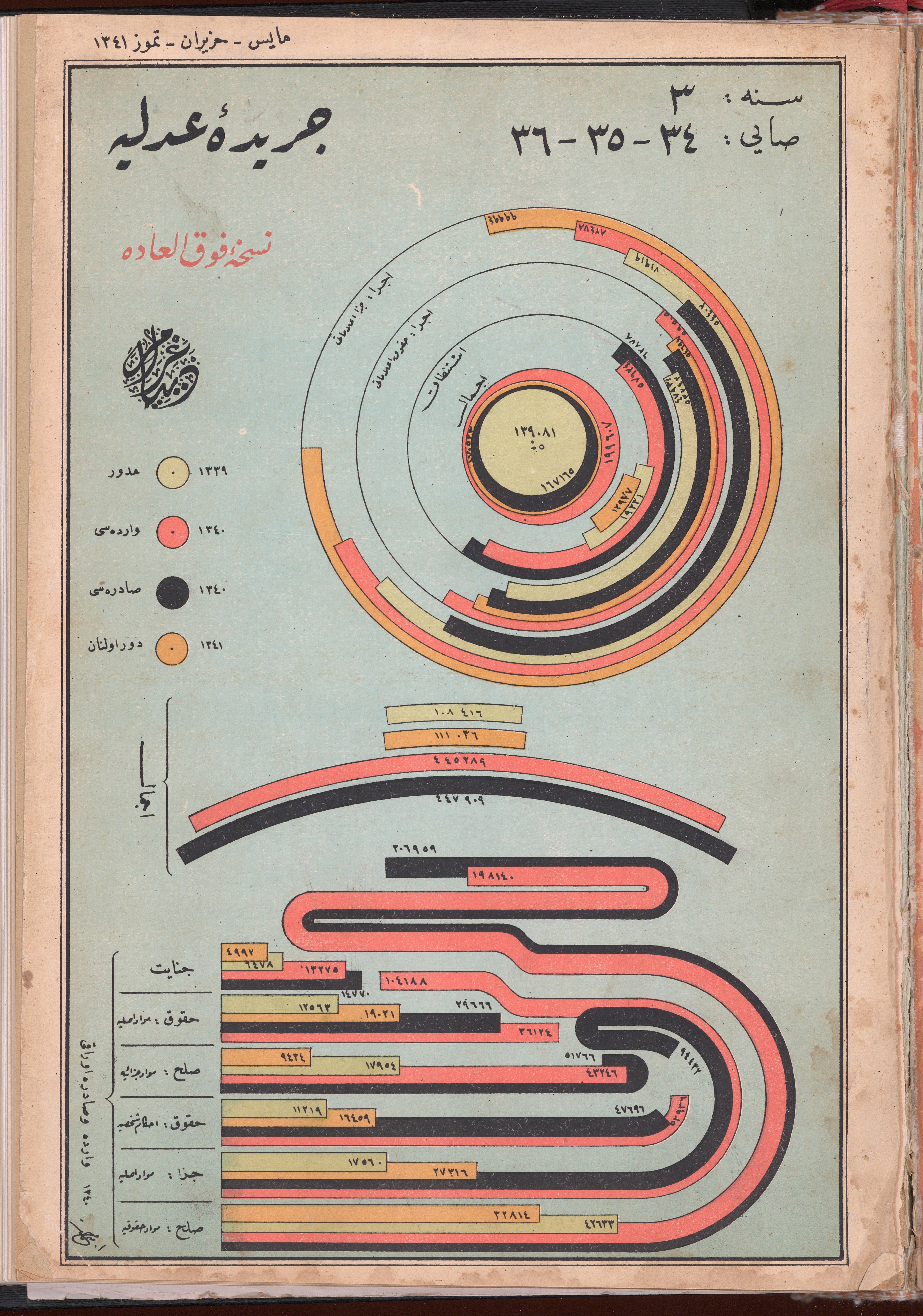 This image is the cover of an issue of "Cerîde-i Adliyye" (The Justice Gazette), published by the Ministry of Justice in Turkey in 1926. The publication dates back to the Ottoman era and continued into the early years of the Turkish Republic. The image represents a sophisticated use of data visualization techniques, which were quite advanced for the time.