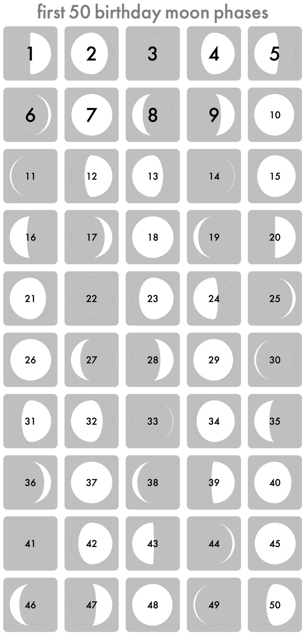 GraphicsGrid of MoonPhase icons, each one representing the moon phase on a birthday. over each icon is a number in futura font, denoting which birthday said moon phase was. across the top is the title "first 50 birthday moon phases"