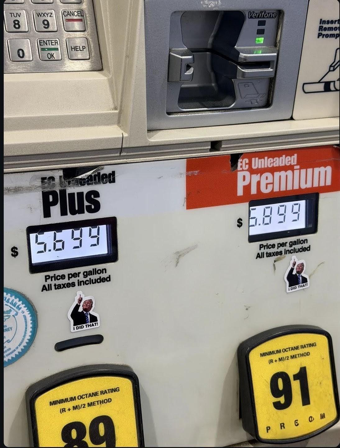 someone has placed stickers of the orange bawbag president trump pointing up at the price that say "I did that!"