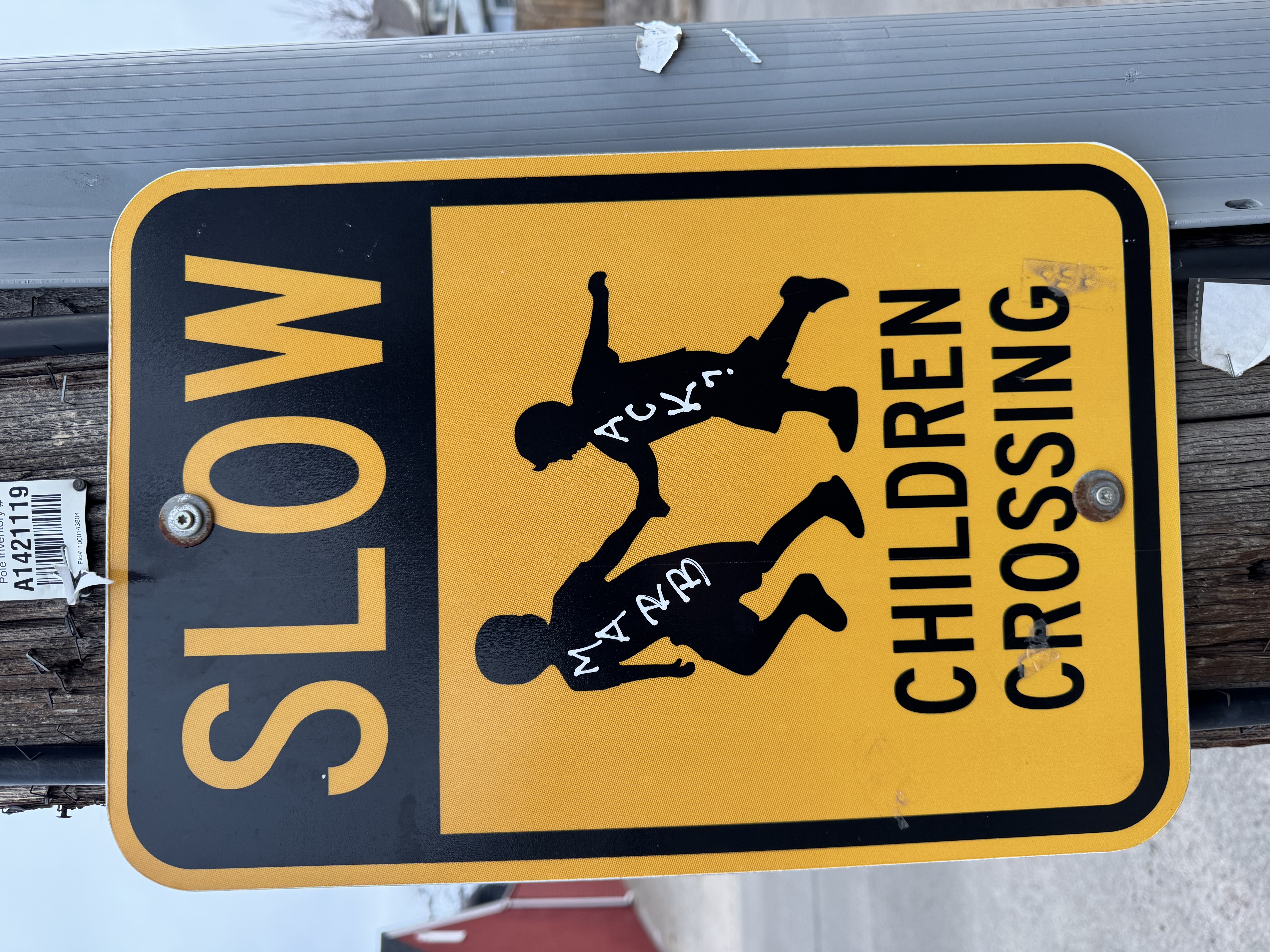 A ‘Slow, children crossing’ sign on a telephone pole. The sign is mostly yellow with some black. The top is black with the word ‘SLOW’ in yellow letters. Below that is a black silhouette on yellow background of two children holding hands and running. Below them are the words ‘CHILDREN CROSSING’ in black, with each word on its own line.