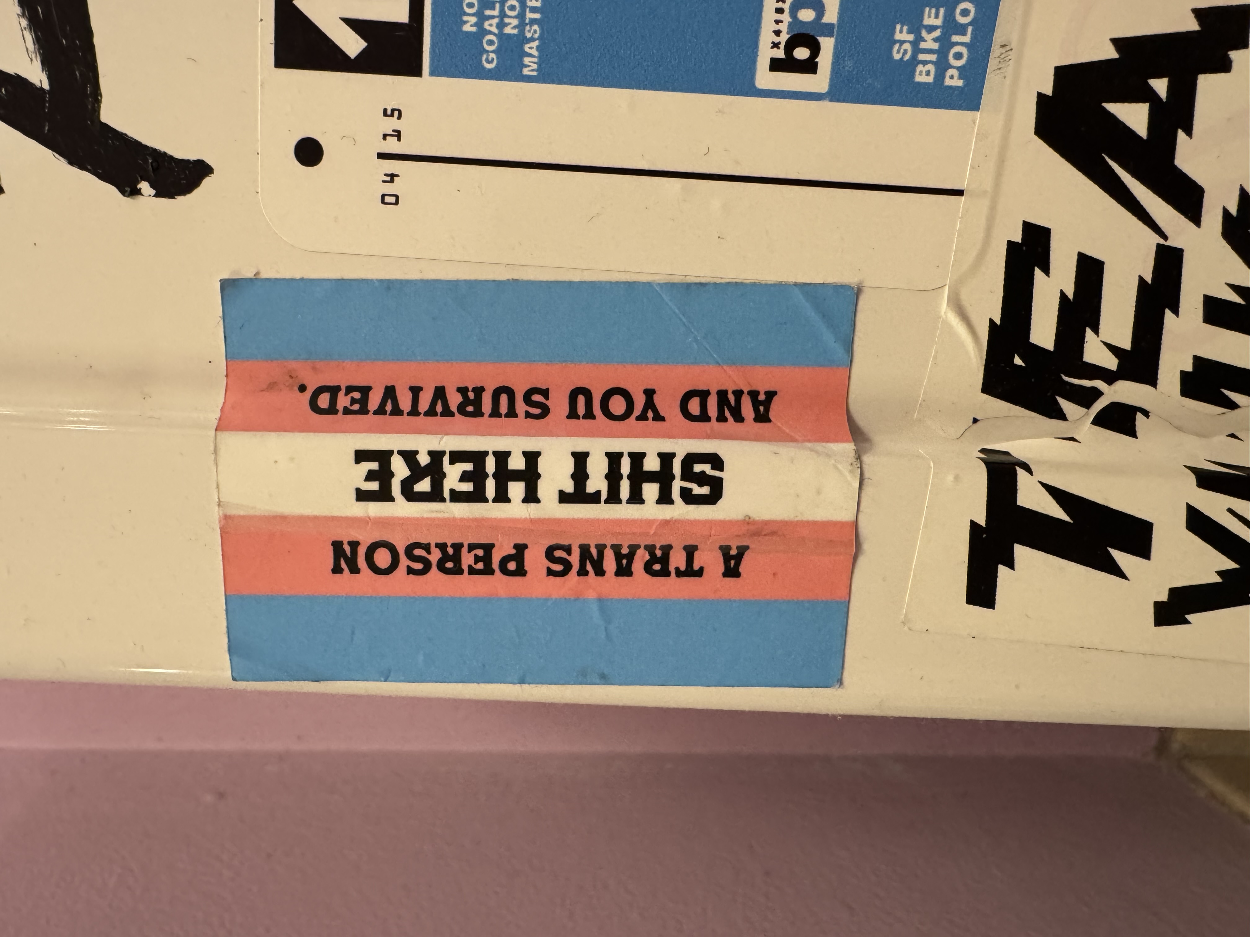 A sticker on a paper towel dispenser in a bathroom. The sticker is a trans pride flag, with stripes of blue, pink, white, pink and blue. On the pink and white stripes reads: