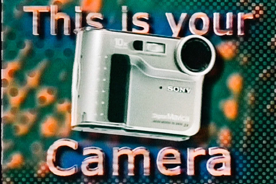 grainy stillframe from a sony mavica promotional video, with the bulky floppy disc-based handicam in center of frame, with the beveled, gold plated text above and below it reading "this is your camera". in the background are layers of loud patterns in yellow and green