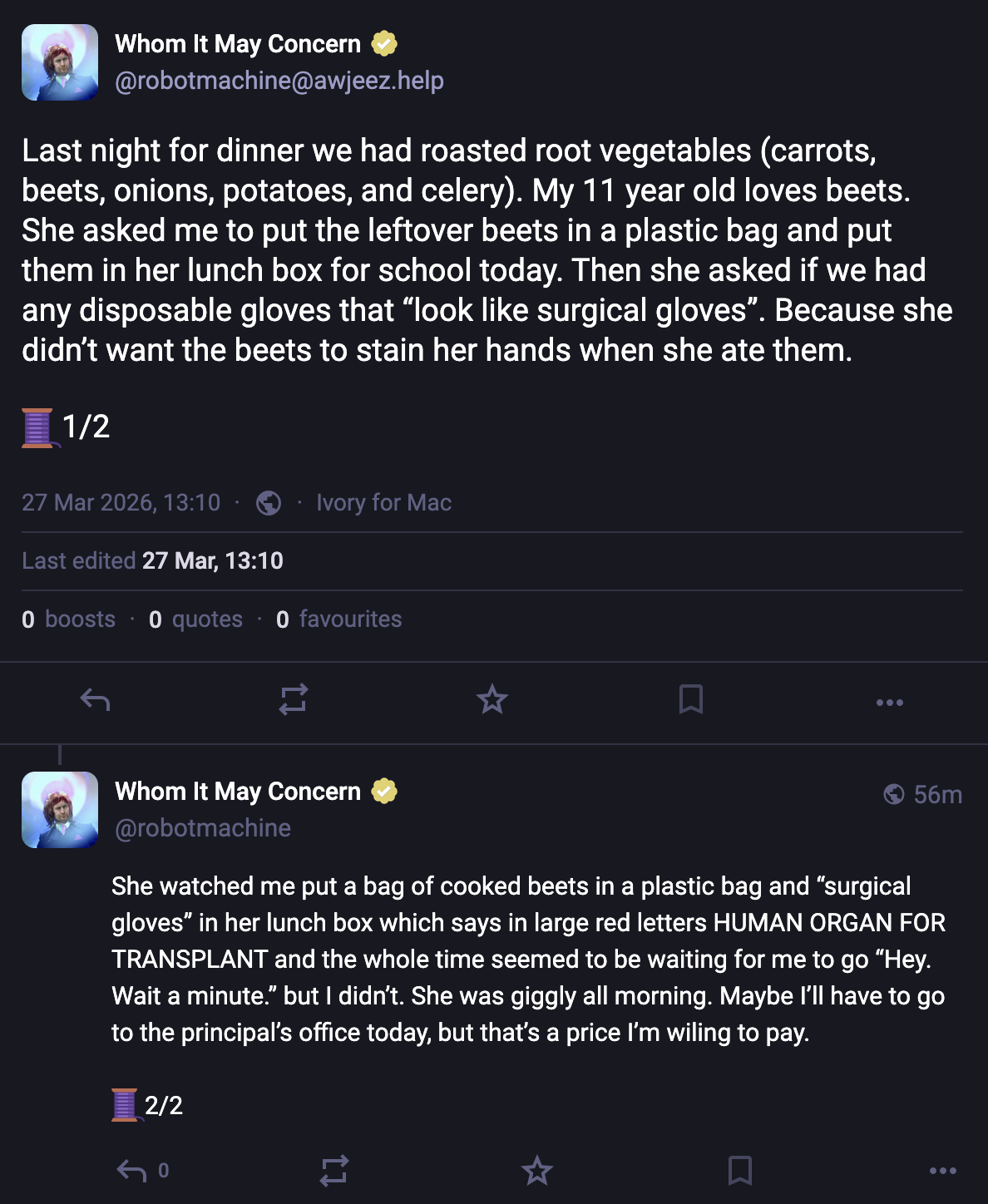 Last night for dinner we had roasted root vegetables (carrots, beets, onions, potatoes, and celery). My 11 year old loves beets. She asked me to put the leftover beets in a plastic bag and put them in her lunch box for school today. Then she asked if we had any disposable gloves that “look like surgical gloves”. Because she didn’t want the beets to stain her hands when she ate them. She watched me put a bag of cooked beets in a plastic bag and “surgical gloves” in her lunch box which says in large red letters HUMAN ORGAN FOR TRANSPLANT and the whole time seemed to be waiting for me to go “Hey. Wait a minute.” but I didn’t. She was giggly all morning. Maybe I’ll have to go to the principal’s office today, but that’s a price I’m wiling to pay.