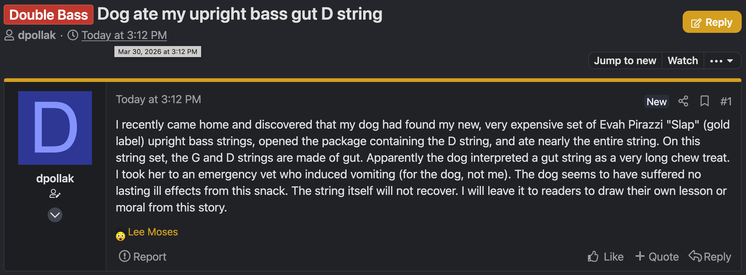 Screenshot of a blog post by user dpollak titled "Double Bass: Dog ate my upright bass gut D string:" "I recently came home and discovered that my dog had found my new, very expensive set of Evah Pirazzi "Slap" (gold label) upright bass strings, opened the package containing the D string, and ate nearly the entire string. On this string set, the G and D strings are made of gut. Apparently the dog interpreted a gut string as a very long chew treat. I took her to an emergency vet who induced vomiting (for the dog, not me). The dog seems to have suffered no lasting ill effects from this snack. The string itself will not recover. I will leave it to readers to draw their own lesson or moral from this story."