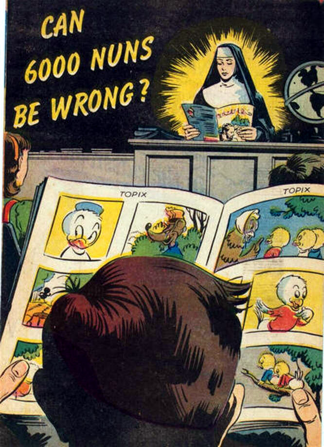 View over shoulder of a child reading Donald Duck comics in a classroom at the head of which stands a nun in a black and white wimple reading from a textbook, a beatific yellow glow around her. Caption says, “CAN 6,000 NUNS BE WRONG?”