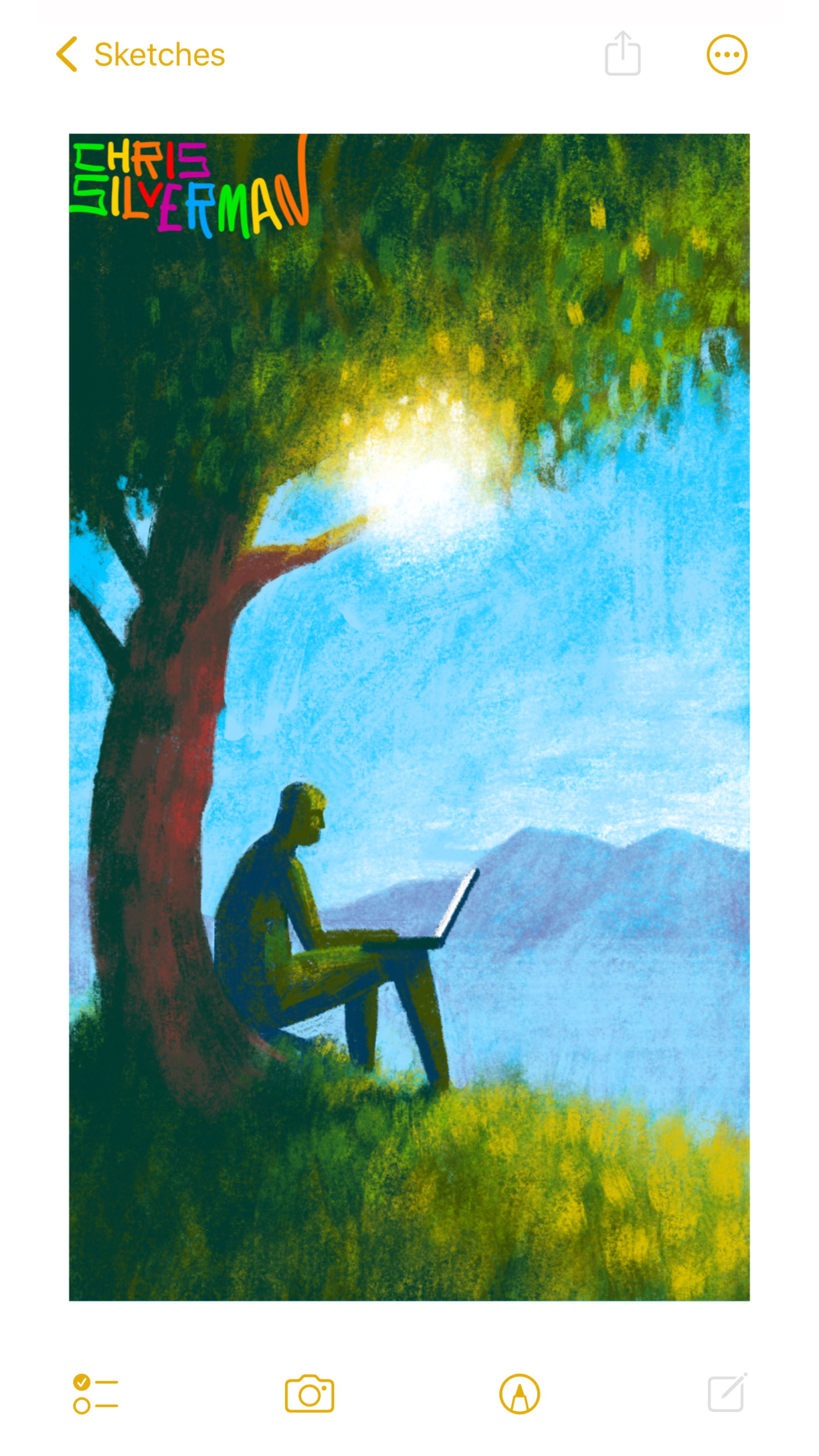 A person sits under a tree on a bright sunny day, working at a laptop. The person is sitting on a lush green hill. Above, the sunlight blazes through the leaves, producing a white-yellow glow. In the distance, a purple mountain range sits under a blue sky. This is an interpretation of Apple Computer's first logo, featuring Isaac Newton. The painting is signed "Chris Silverman" in rainbow lettering.