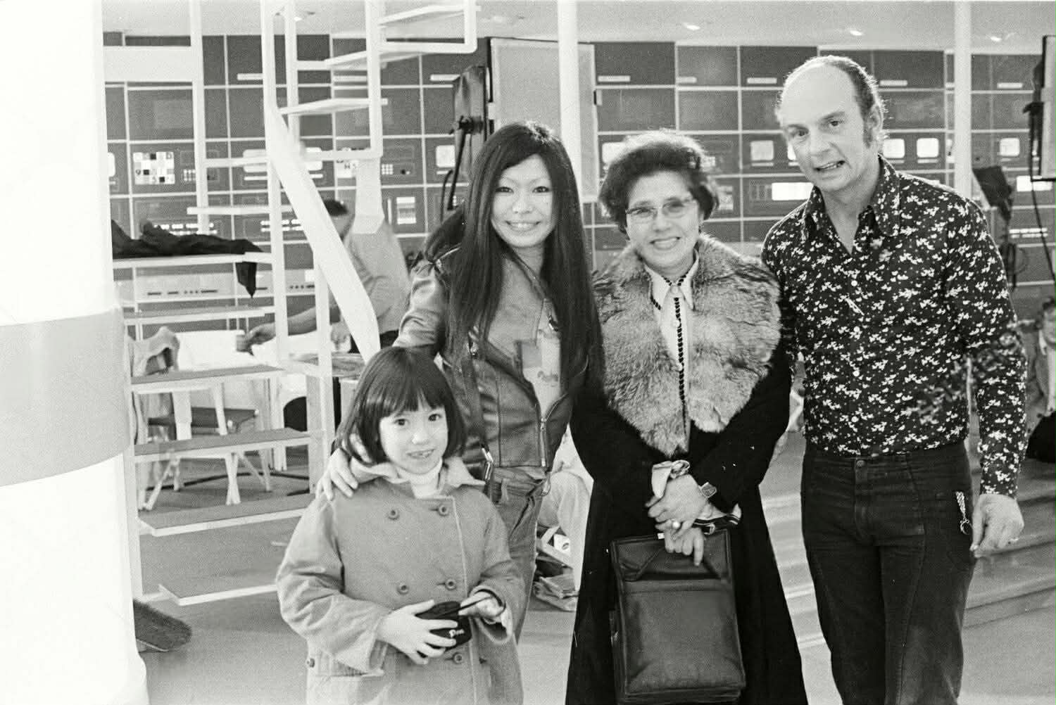 "Just had this photo sent to me, posted on Space: 1999 Art, Fans & BTS facebook page... me, Mum, Tamiko (gran) and Ray Austin on the set of Space 1999, in Pinewood. Happy memories of running about in the moondust and only a slight disappointment discovering that the doors had to be manually operated by stagehands and didn't whoosh open as you approached..."