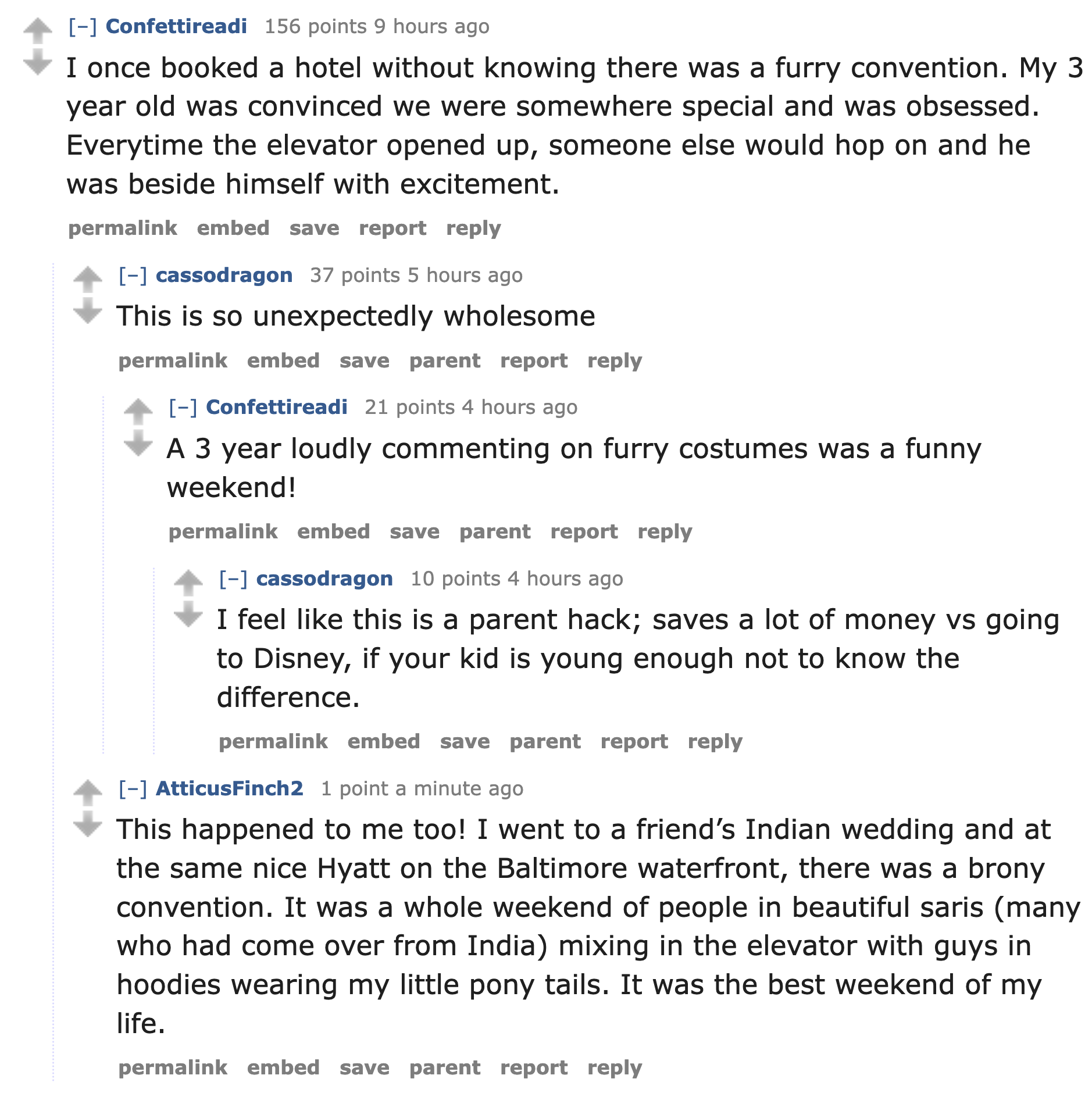 Confettireadi: I once booked a hotel without knowing there was a furry convention. My 3 year old was convinced we were somewhere special and was obsessed. Everytime the elevator opened up, someone else would hop on and he was beside himself with excitement.