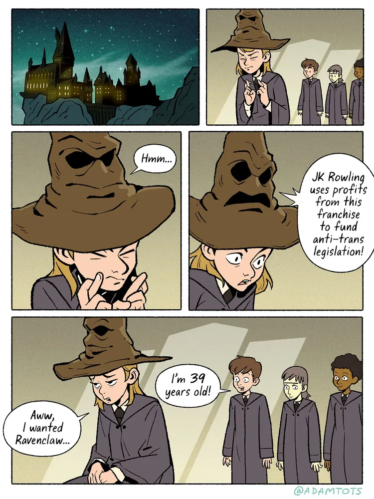 4: The sorting hat says, "JK Rowling uses profits from this franchise to fund anti-trans legislation!" The girl looks upset.