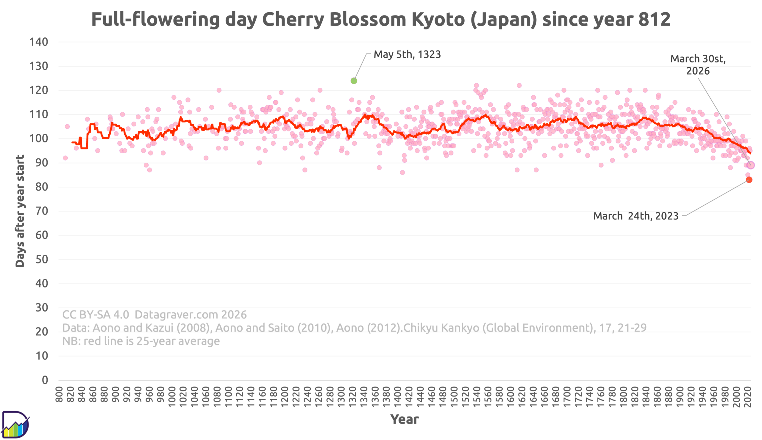 Kyoto cherry blossom full flowering days since the year 812