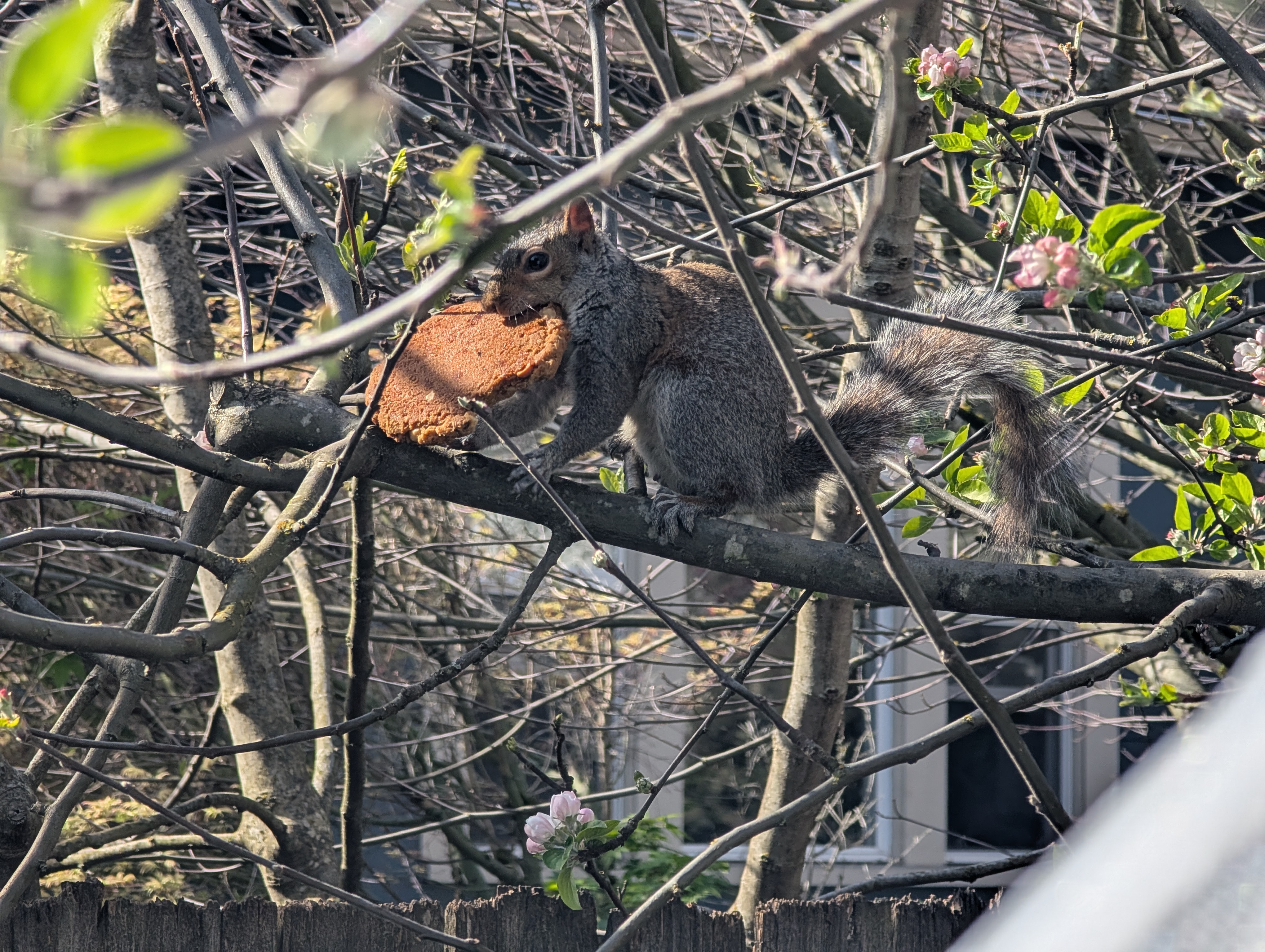 "That's the squirrel [neighbor] feeds." The squirrel looked at us a while and then climbed to the top of the tree, where it had wedged a massive cookie. It grabbed it and ran off. "And that's [neighbor]'s cookie!"