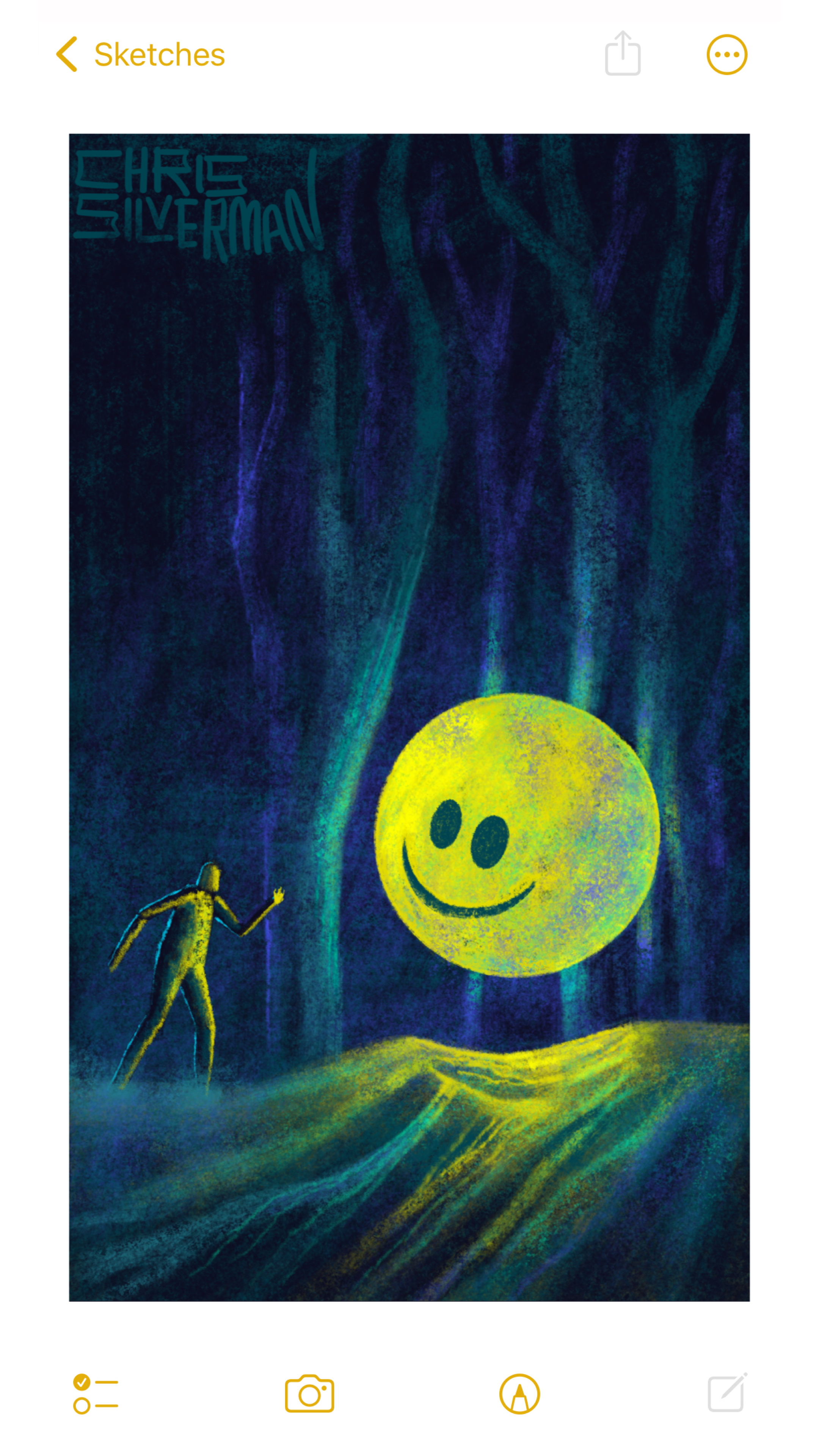 A large round yellow smiley face floats through an eerie woods on a dark night. The face is glowing and slightly translucent. It casts a yellowish-green light on the trees around it. The tree trunks are dark indigo and green, looming out of the shadows. The smiley face casts an iridescent, yellowish-green glow on the cracked ground as well. To the left, a figure is pursuing the face. The figure is illuminated bright yellow by the face, and it and the trunks around it are slightly lit from another bluish light source off screen. The painting is signed "Chris Silverman".