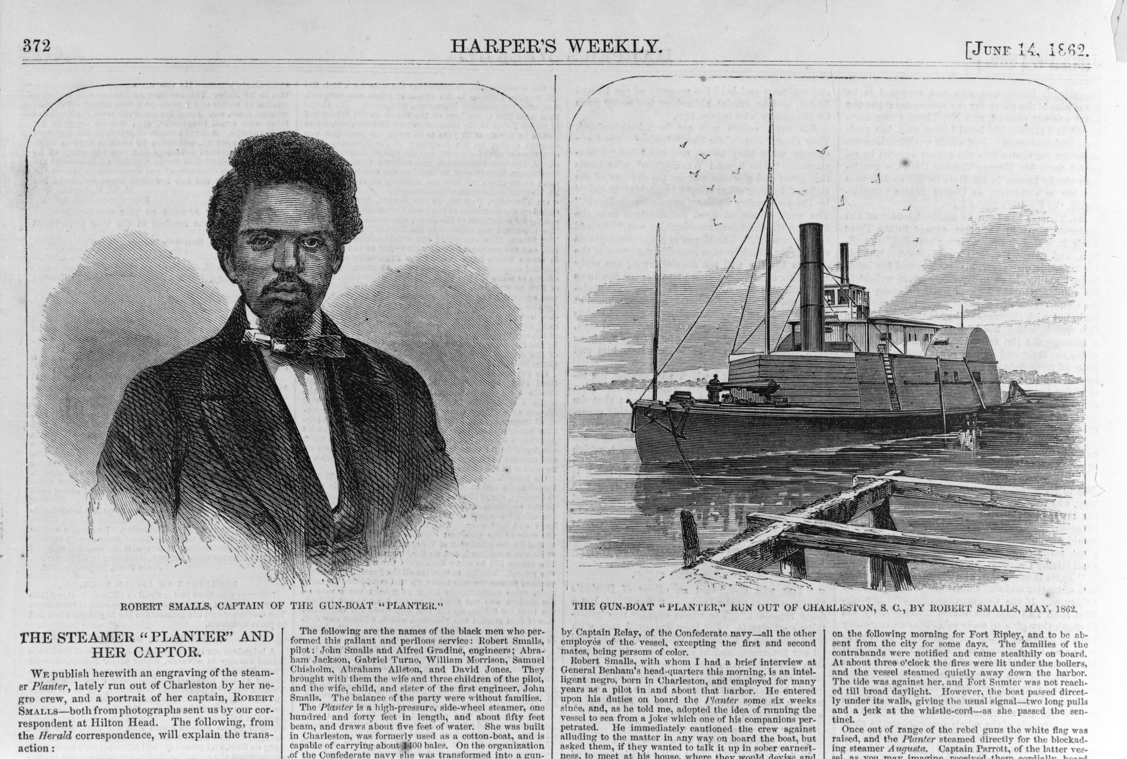 A page from an 1862 issue of Harper's Weekly showing, on the left, an engraving of Robert Smalls, a bearded young Black man in coat and tie looking forward, and on the right, the Planter, a small ship at rest on the water in front of a pier.