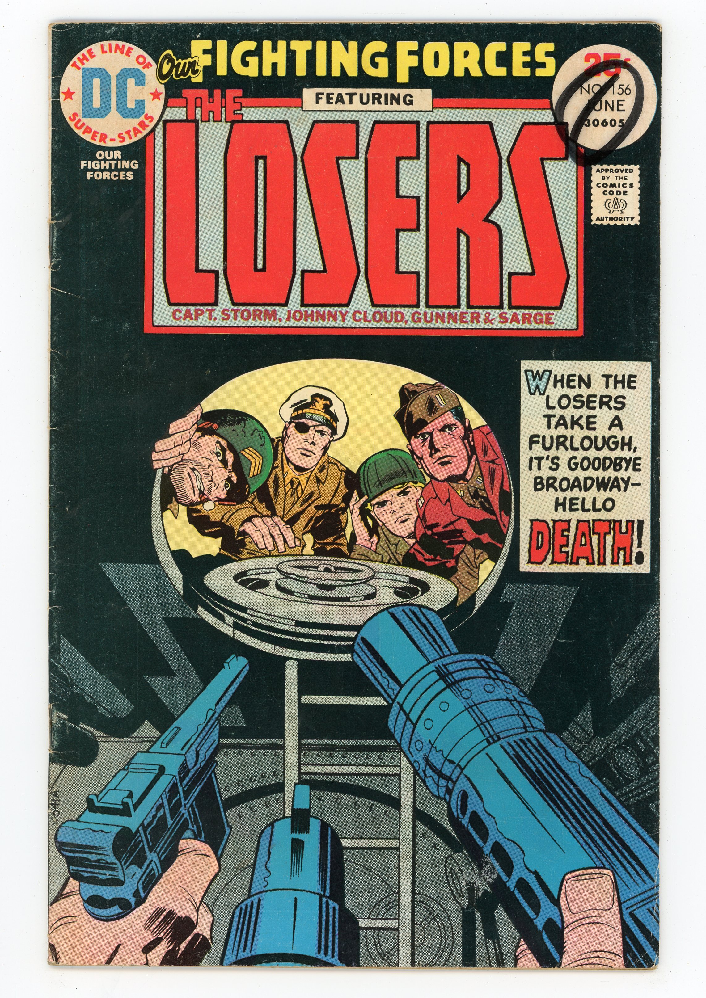 The cover from a comic book, "Our Fighting Forces featuring the Loseres: Capt. Storm, Johnny Cloud, Gunner & Sarge". "When the losers take a furlough, it's goodbye Broadway--hello Death! The cover shows four figures in uniform (in in an eyepatch and captain's hat) peering down a circular manhole into a metal-lined vault. There, three hands hold elaborate, Kirby-style firearms pointed at them.