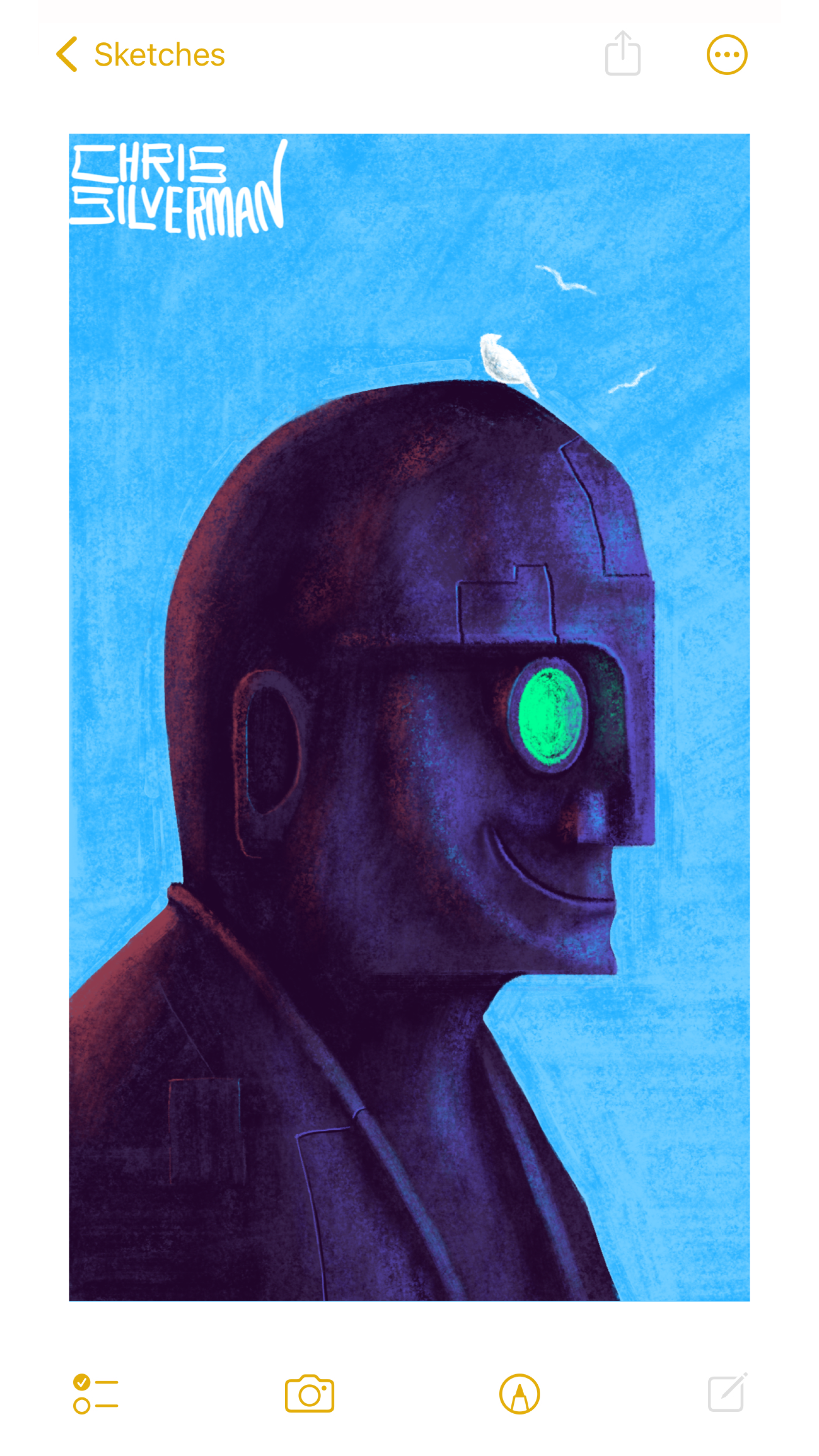 A person seen in profile. Or something that resembles a person, anyway: perfectly smooth head; hard, straight nose; unsettling smile; and glowing green round spectacles. The person is purple, and looks they are made from metal. The outlines of a few rectangular panels are visible. In addition to the bright blue sky around them, they are slightly illuminated from the rear by a reddish light. Perched on top of their head is a white bird, tiny by comparison, with a few more birds in the sky. The painting is signed "Chris Silverman".