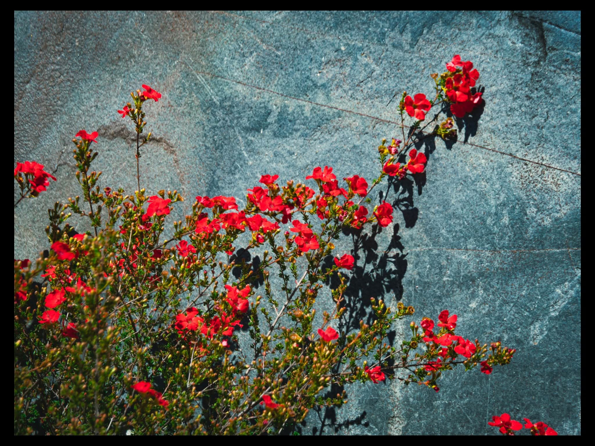 Red flowers against a stone wall