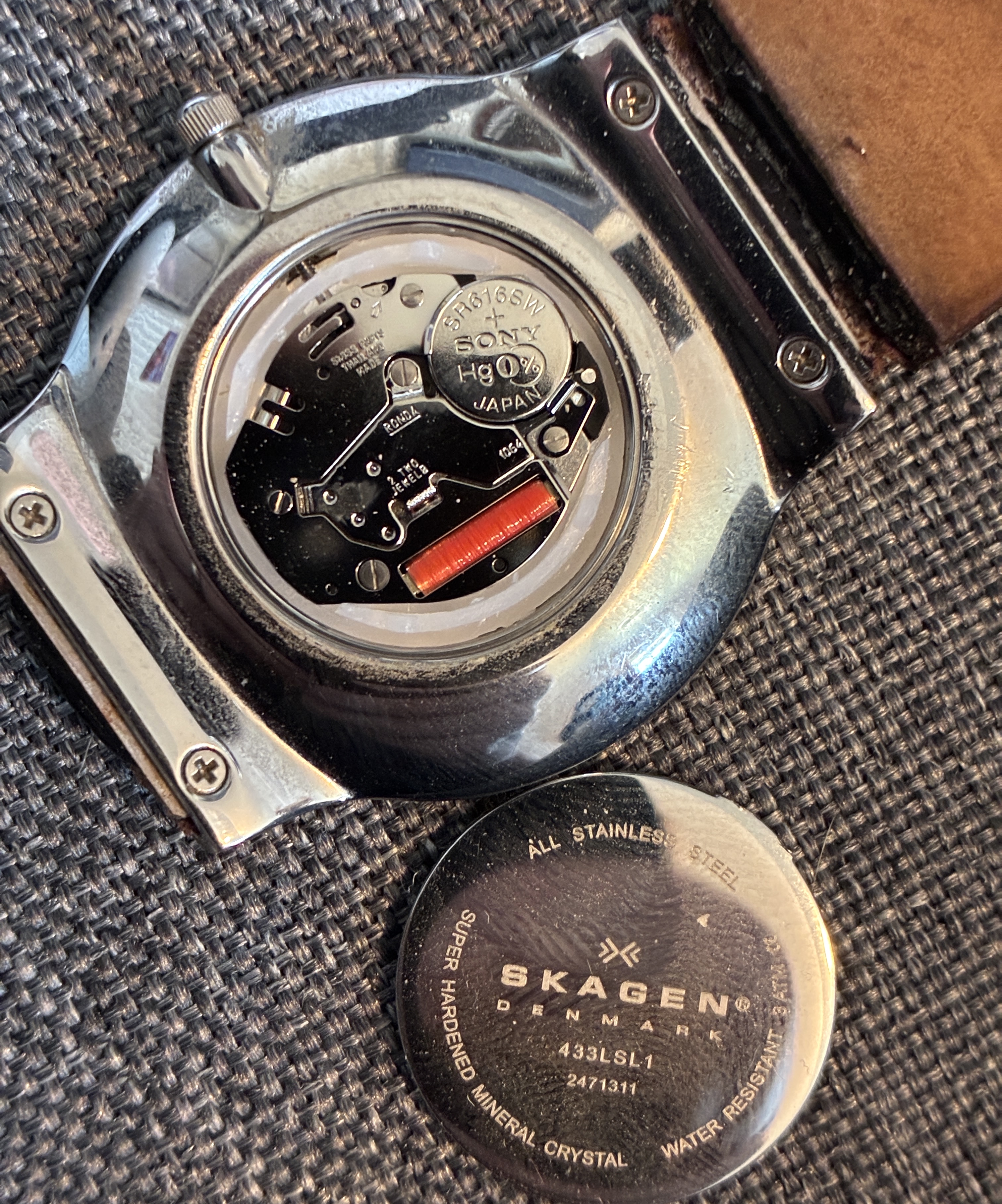 The backside of a wrist watch with its battery panel open and to the side. The panel shows the manufacturer (Skagen from Denmark). The watch's battery and some mechanical components are visible. The band is in rough shape.