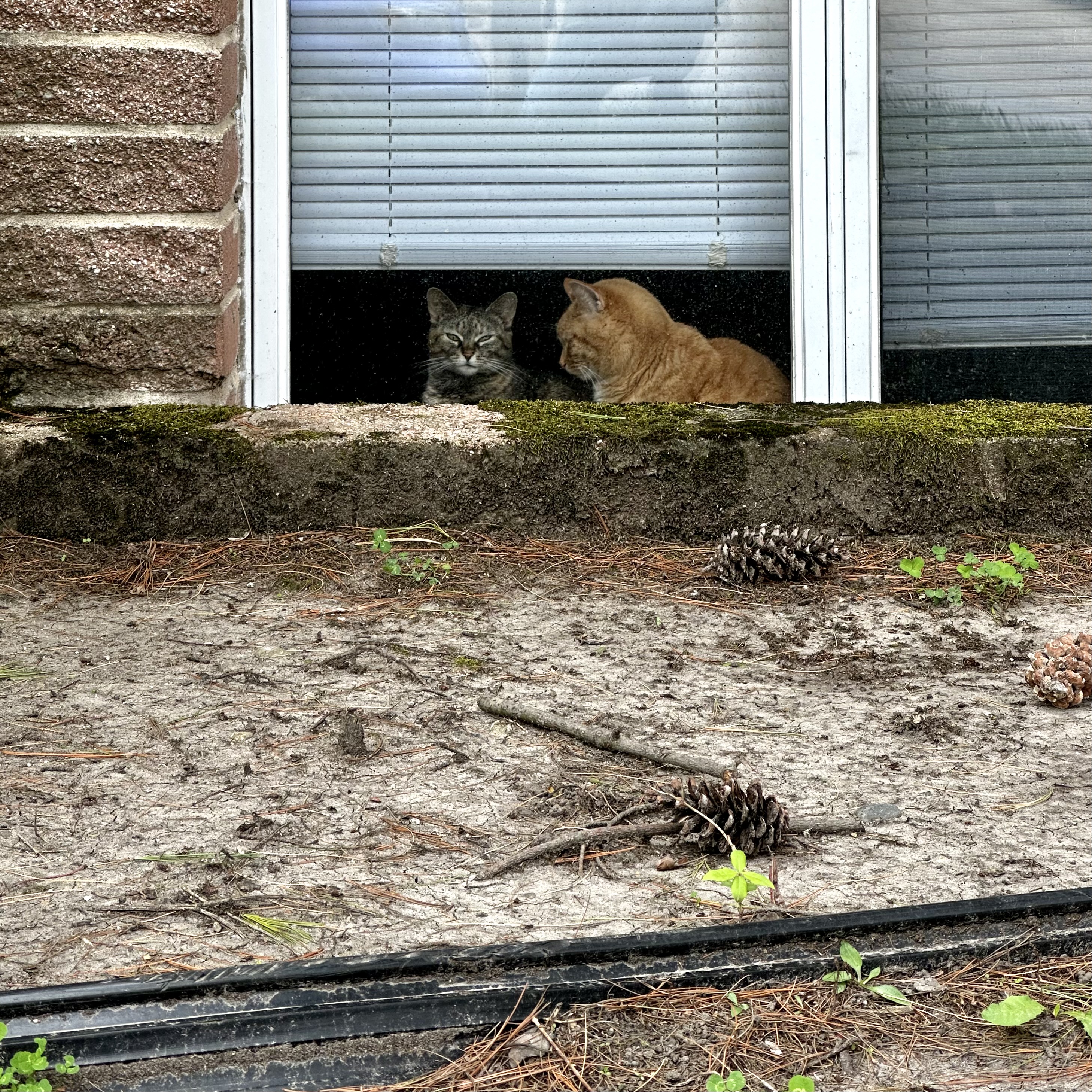 two cats are partly visible out of a basement window: a grey striped one glaring directly out at the camera, and a marmalade cat turned directly at the first cat.
