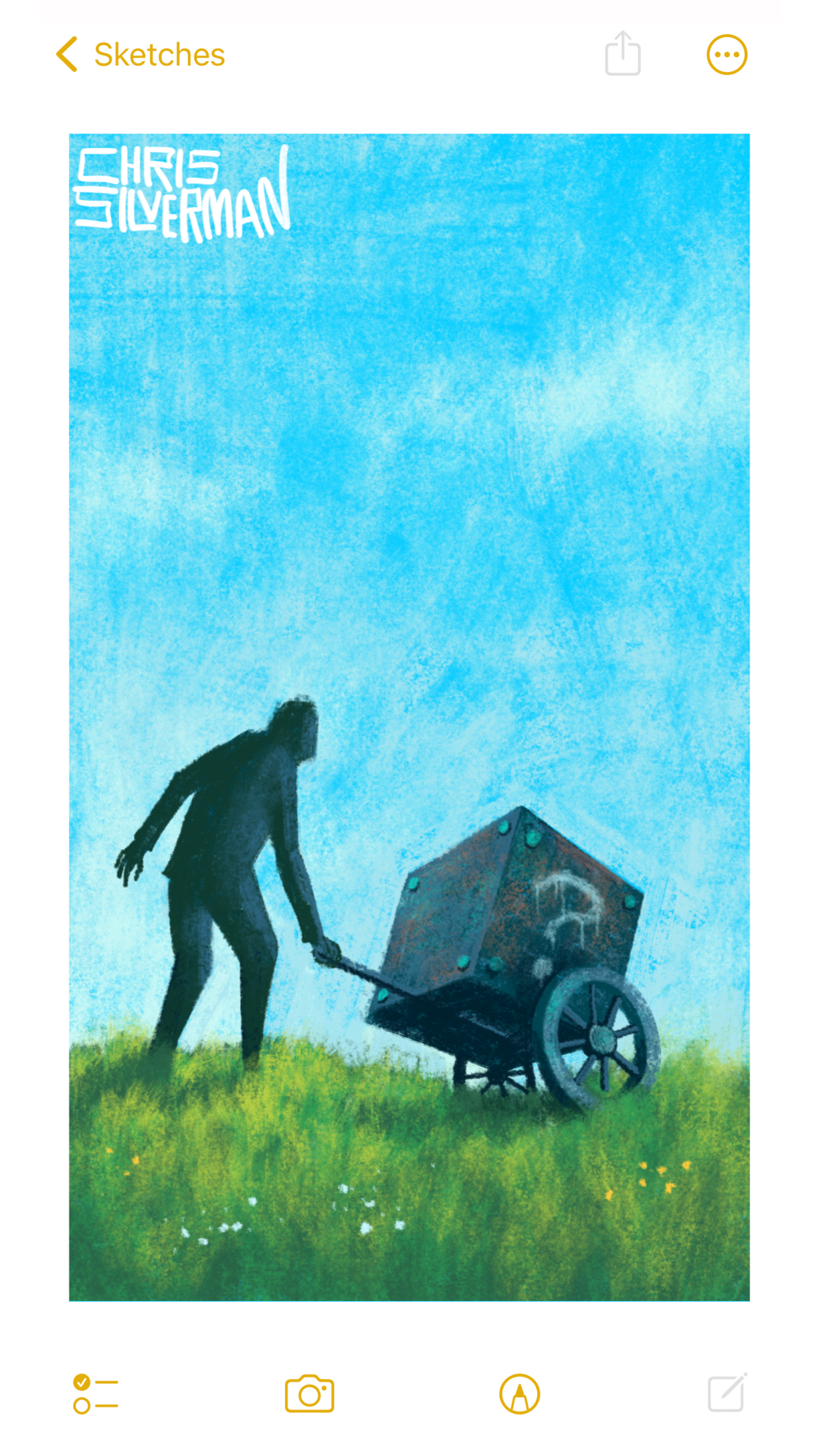 A dark figure pushes a cart through a bright green meadow under a mostly clear, blue sky. In the cart is a large, rusty, metal cube with a white question mark roughly spray-painted on one side. The cube looks like those question boxes in Nintendo games. There are a few colorful wildflowers dotting the meadow, and a wispy cloud or two in the sky. The painting is signed "Chris Silverman".