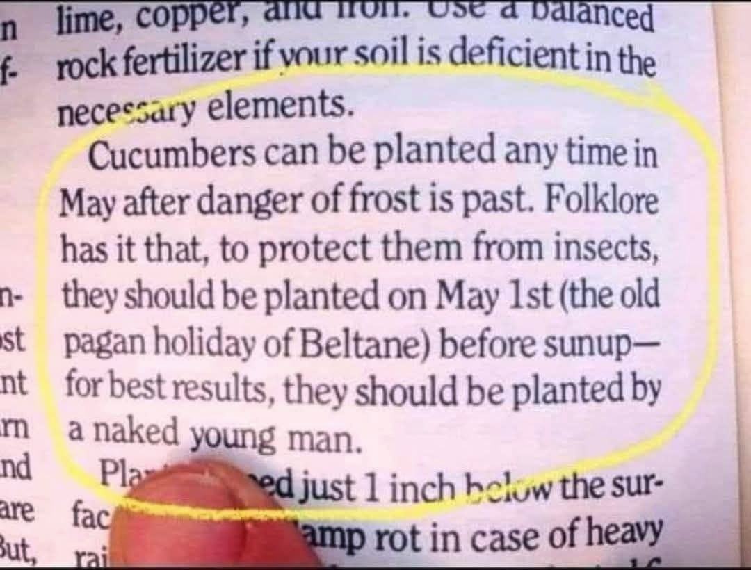 This makes sense though - if it's warm enough for a young man to be running around nekkid before sunrise, then it's warm enough to plant cucumbers.