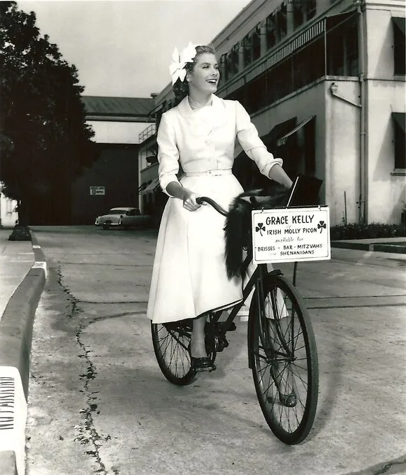 Black and white photograph of a woman in a white dress wearing a white hat riding a bicycle down a cement driveway. Behind her are a tree and what is maybe an industrial building, with a 1950s car parked by it. There's a sign on the front of her bicycle that says, "Grace Kelly, Irish Molly Picon, available for Brisses, Bar Mitzvahs, and Shenanigans".