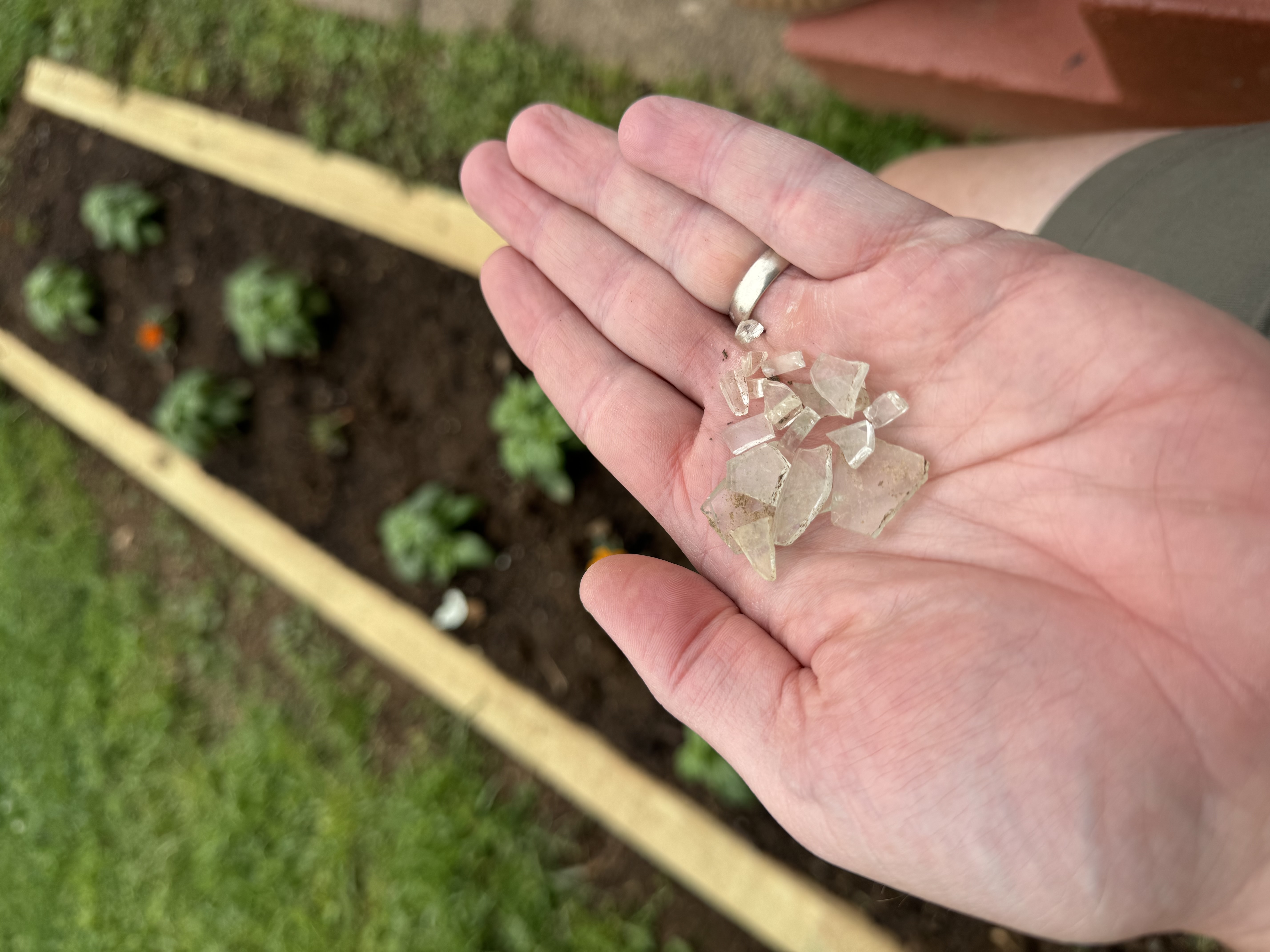 Every year our basil garden gives up another handful of broken glass from years past. The amount has diminished each year, but putting in replacement timbers this year exposed some sections that had been covered for years.