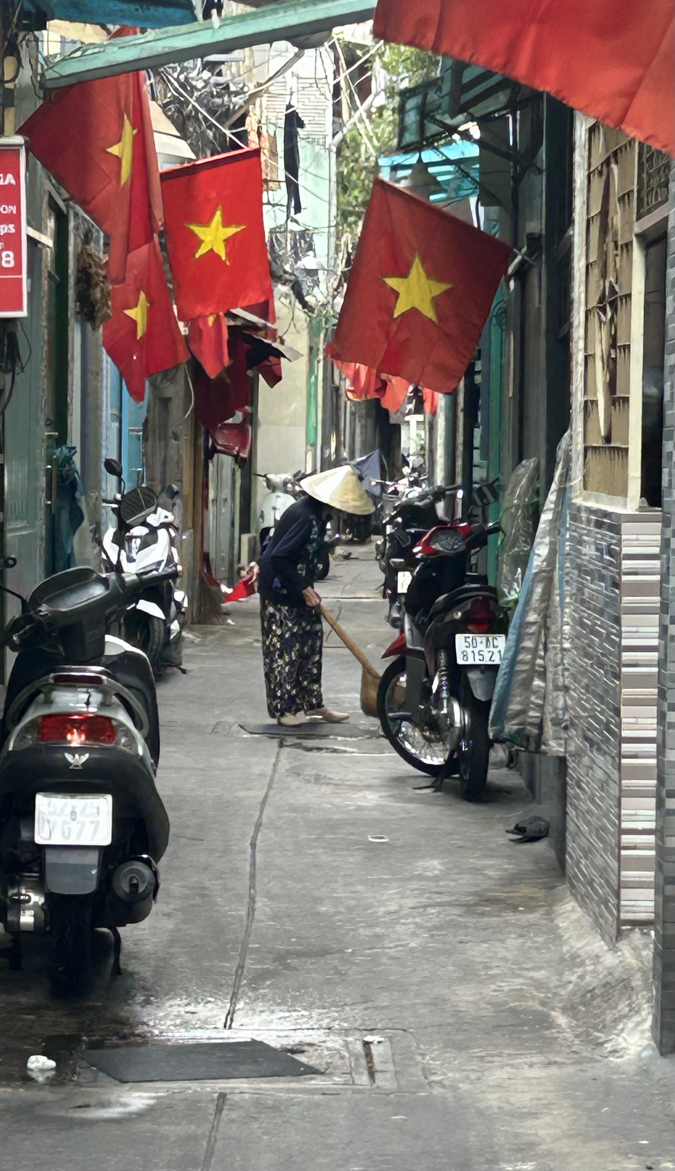 Long view down a narrow alley festooned with Vietnamese flags (a yellow 4-pointed star on a red field) at a woman in a conical straw hat sweeping the pavement between doorsteps and parked motor scooters