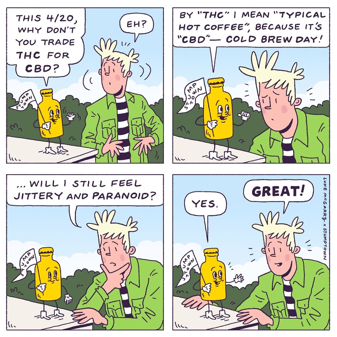 the bottle excitedly says "by THC i mean "Typically Hot Coffee", because it's CBD- Cold Brew Day!" as the cartoonist looks confused.