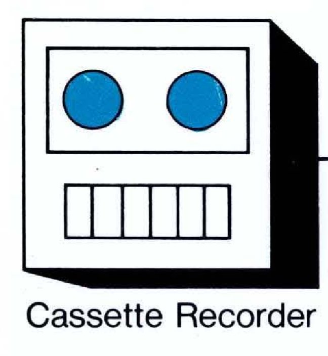 diagram of a cassette recorder component from a 1970s system schematic. It is a square with an upper rectangular panel containing two blue circles side by side (tape spools, supposedly) and below are six keys that look like a mouth with teeth. It is labelled "Cassette Recorder".