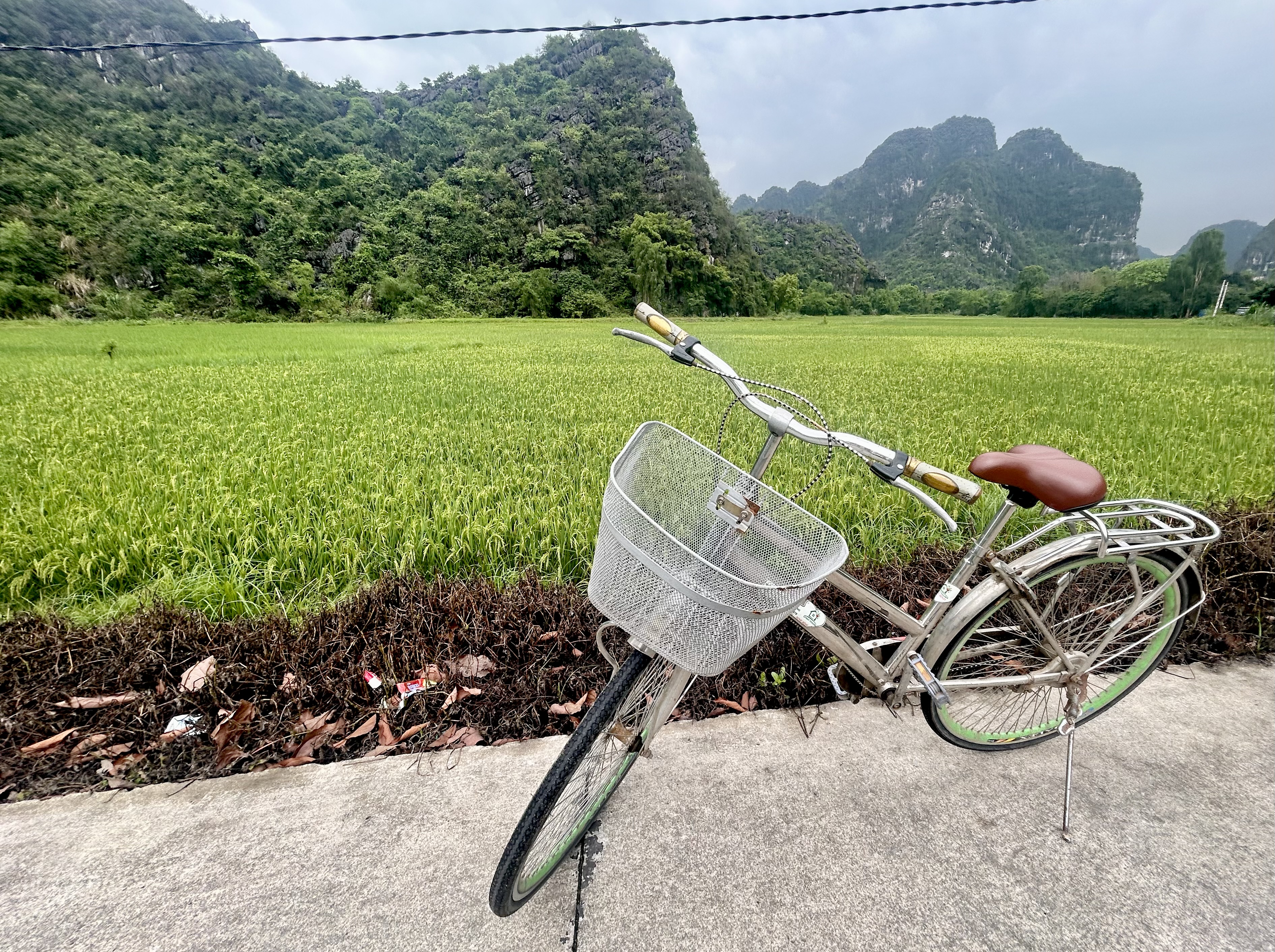 A shiny chrome bicycle stands alone on its kickstand before a vibrantly green rice paddy with sharp limestone ridges in the background framing a cloudy gray sky