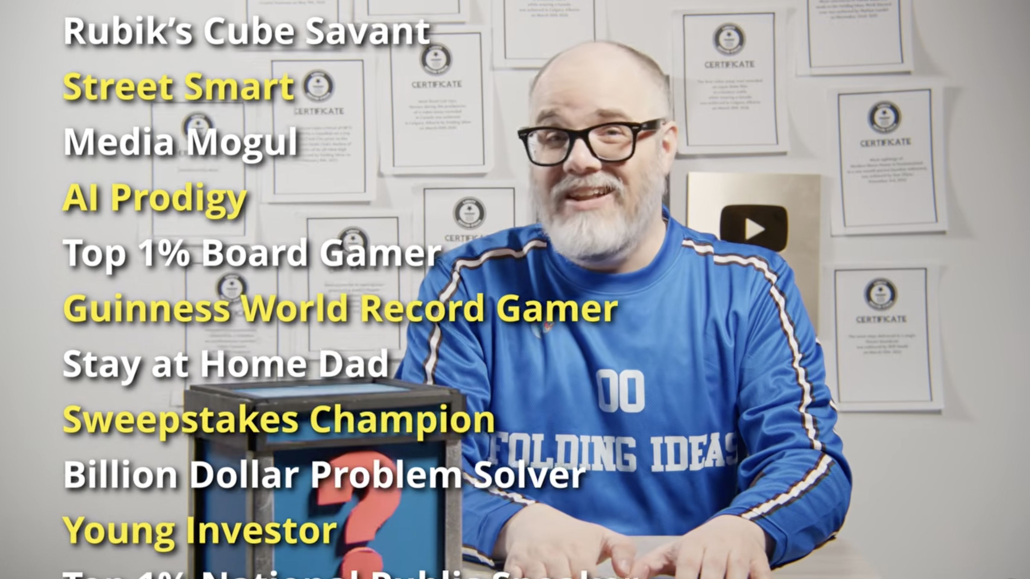 screenshot of youtube essayist dan olson (caucasian, balding male with beard and black frame glasses, wearing a blue long-sleeve jersey that reads "00 folding ideas") grimaces as the camera as a list of "titles" scroll down the screen. the titles include