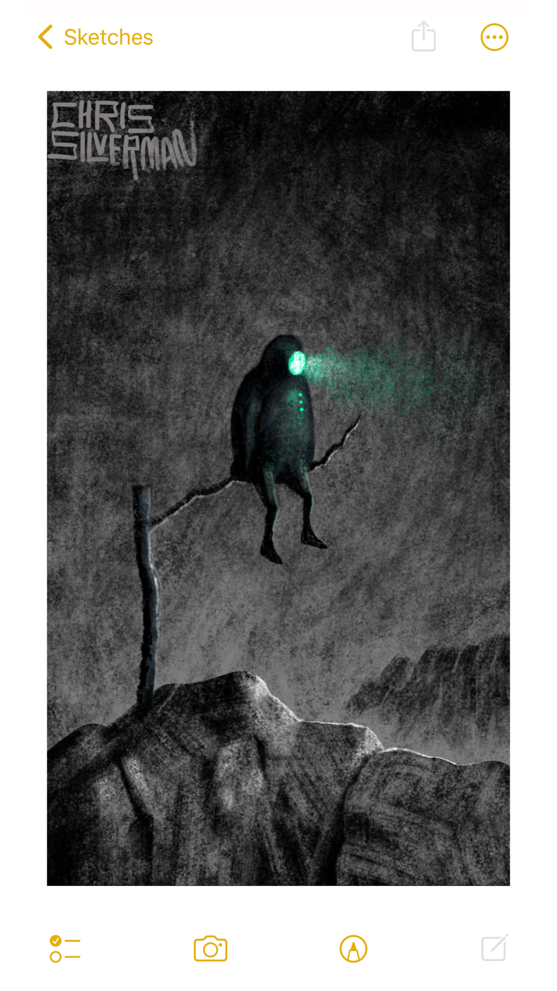 A dark, rocky place. Everything is gray. A post is planted on a rocky hill. Sticking out of the right side of the post is a long branch, on which is sitting a figure wearing a dark, shiny, full-body suit. Where the figure's face would be is a glowing green faceplate casting a beam of greenish light. The figure has three green buttons on its chest. In the background is the dim outline of another rocky ridge. The painting is signed "Chris Silverman".