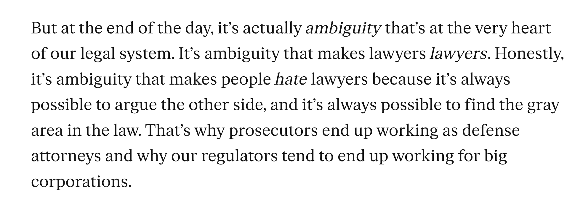 Nilay probably didn't intend to set off my pedantic tendencies here, but the last sentence in the screenshot, in my reading, conflates what makes it possible vs why people do it. Ambiguity in the law is what makes these career moves possible. But what might motivate a prosecutor to become a defense attorney is not what motivates a regulator to go work for the regulated. One of these moves is highly, unignorably lucrative, and the other is not.