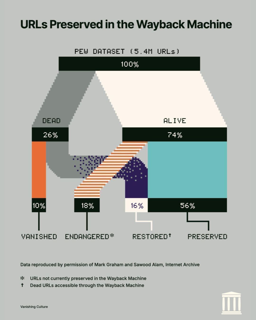 Infographic titled "URLs Preserved in the Wayback Machine" based on a dataset of 5.4 million URLs. It shows 26% of web pages are dead and 74% are still alive. Of the total, 10% have vanished completely, 18% are endangered (not yet preserved), 16% have been restored through the Wayback Machine, and 56% are preserved. The visual uses a flow-style diagram to show how preservation reduces permanent loss.