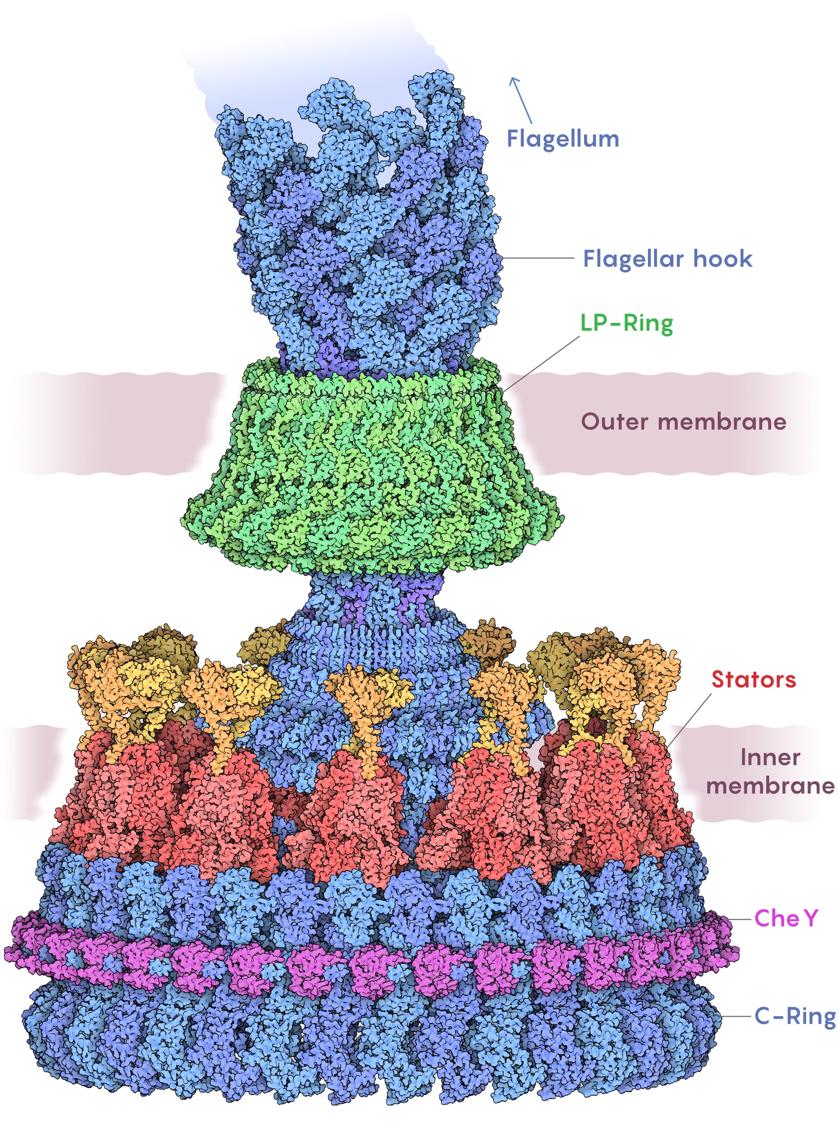 A colored illustration of the physical mechanism that makes a flagella inside a bacteria cell work