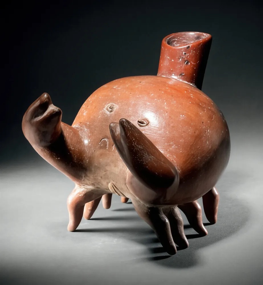 official auction photo of the crab effigy vessel, redware ceramic, globular body standing on 8 legs with two claws and incised face details, single spout on top