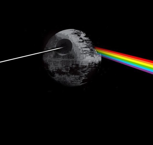 image of the under-construction second Death Star from "Star Wars: Return of the Jedi" with a white beam entering the laser cannon and a rainbow emerging out the back, emulating the cover art for Pink Floyd's "Dark Side of the Moon"